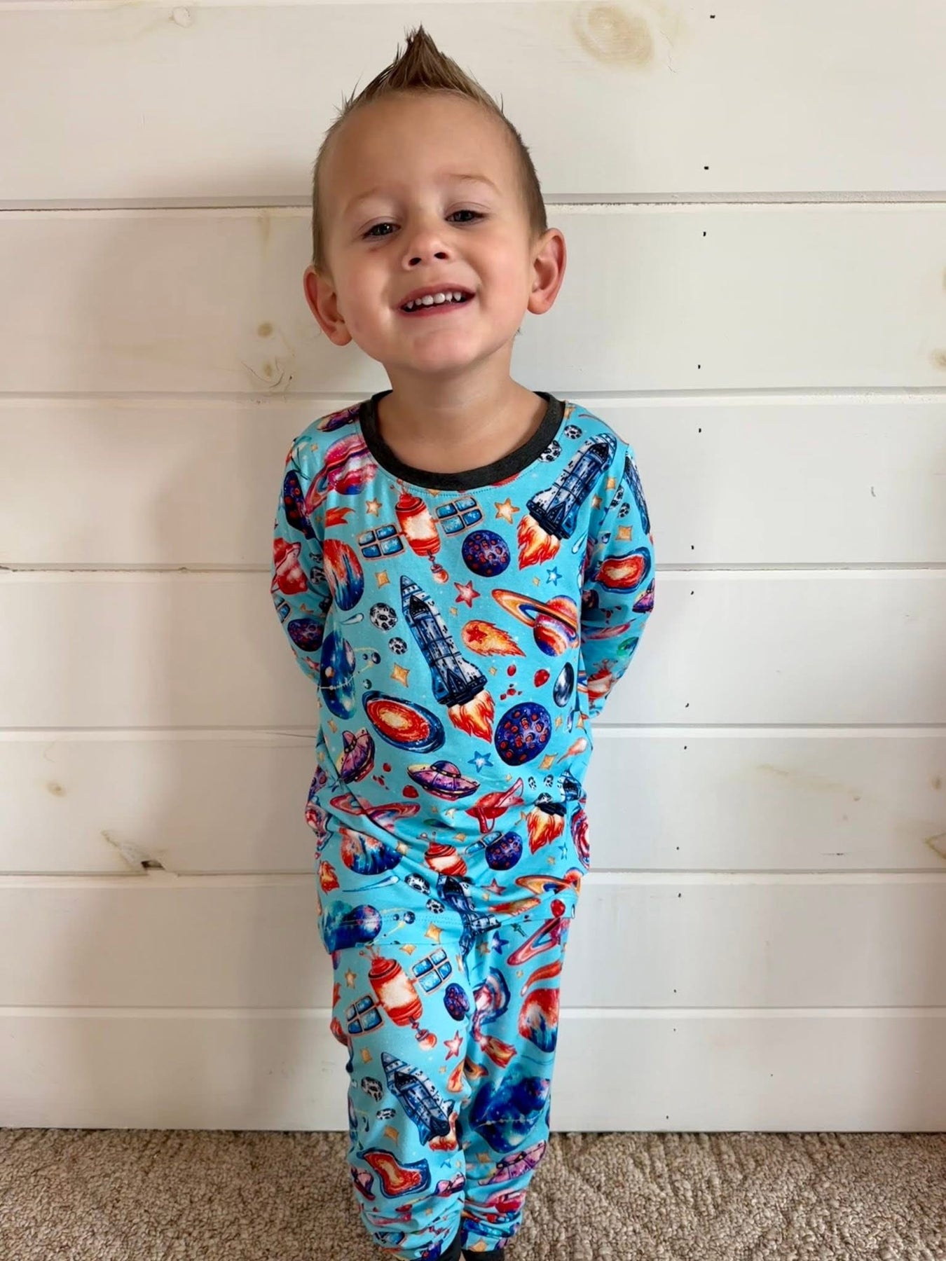 The Cosmic Cuddles Two-Piece Pajama Set 🌌 is made for dreamers with big imaginations. Featuring BlueBear’s hand-drawn watercolor planets and rockets on a vibrant light-blue background, this set is finished with charcoal heather trim for a clean, elevated look. Crafted from our signature bamboo fabric, it’s breathable, buttery soft, and perfect for all-night comfort.