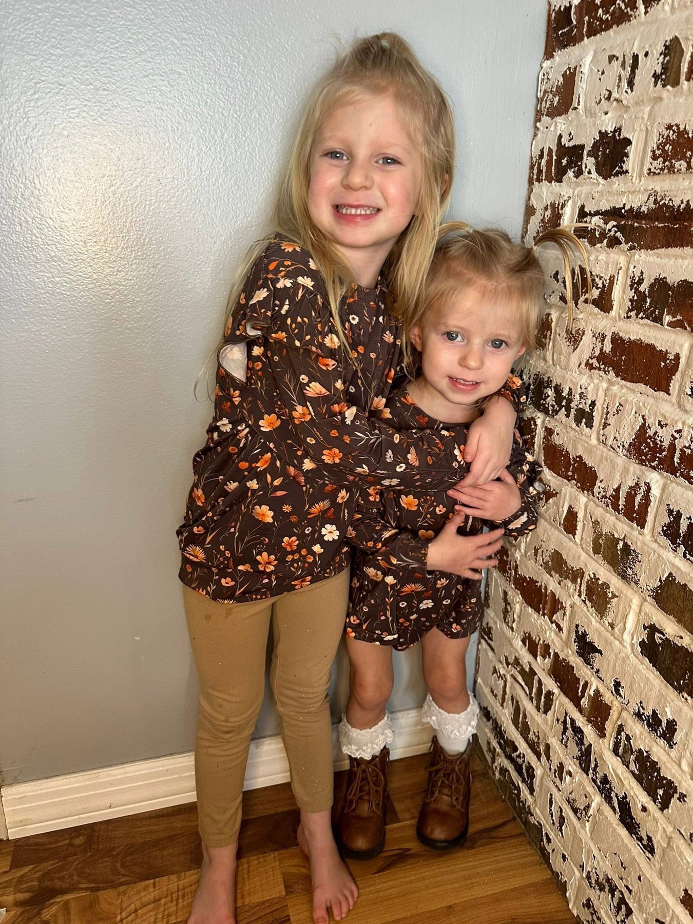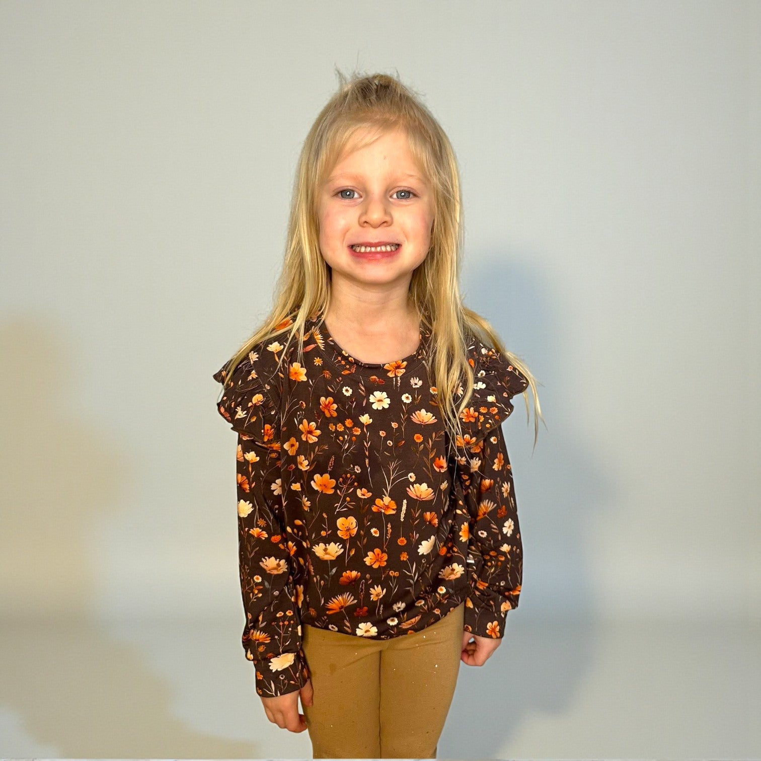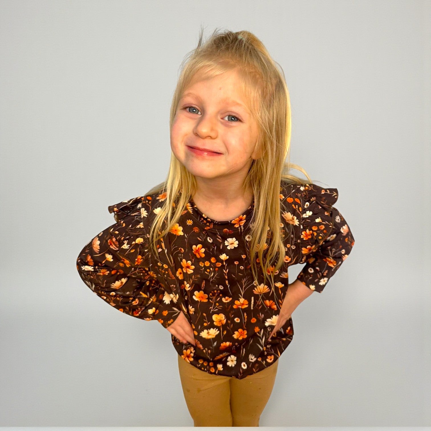 Chic meets cozy in the Merritt’s Meadow ruffle shoulder sweatshirt. The sweet shoulder detail adds a touch of whimsy to this warm, chocolate-toned floral. Made from Brooksees’ signature bamboo terry blend for softness and stretch, it’s the perfect layering piece for fall, playdates, or family outings.