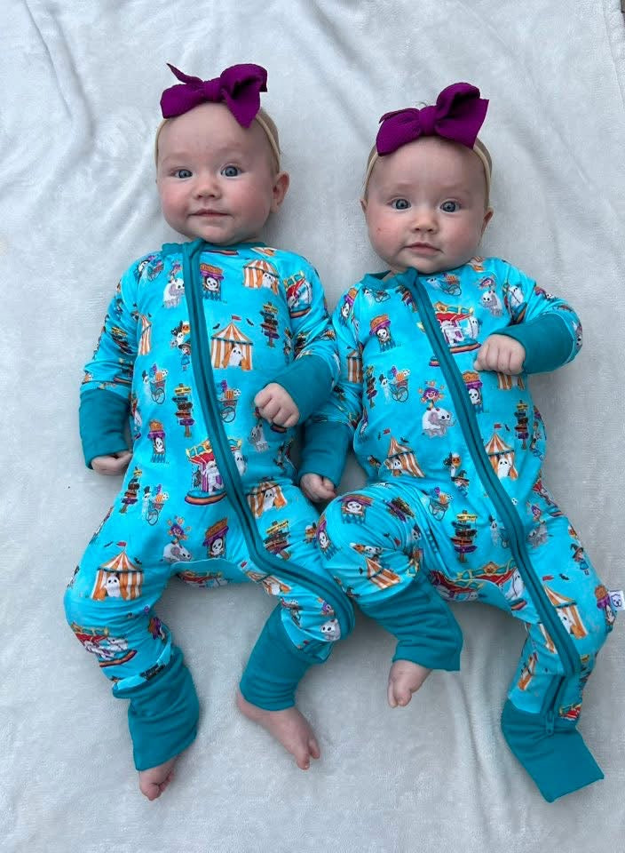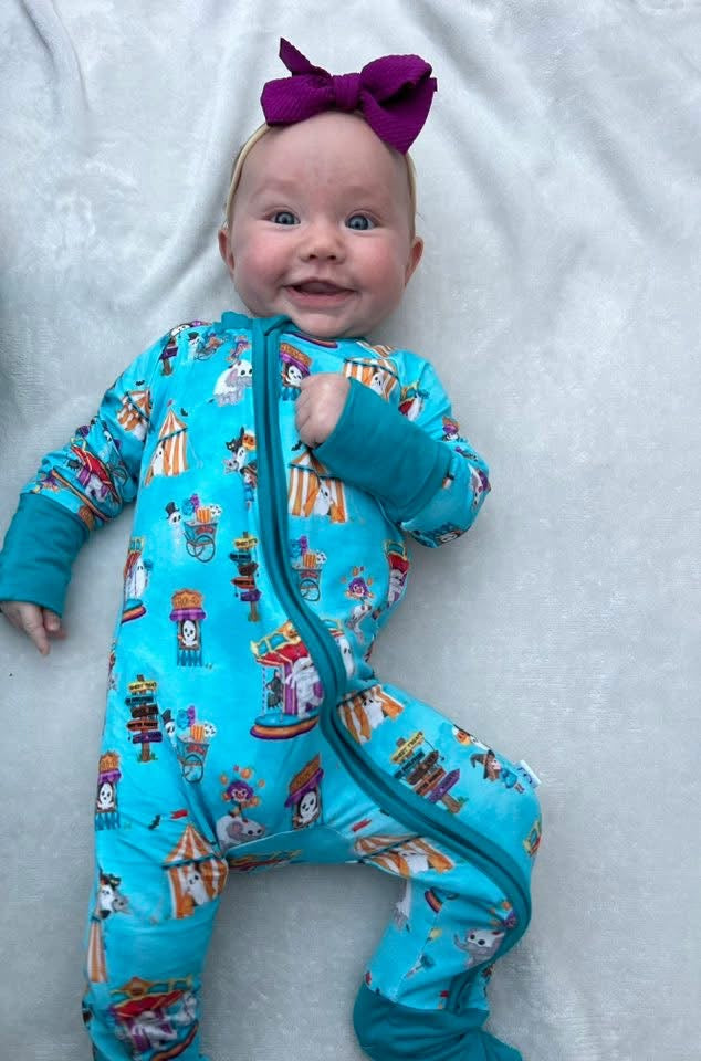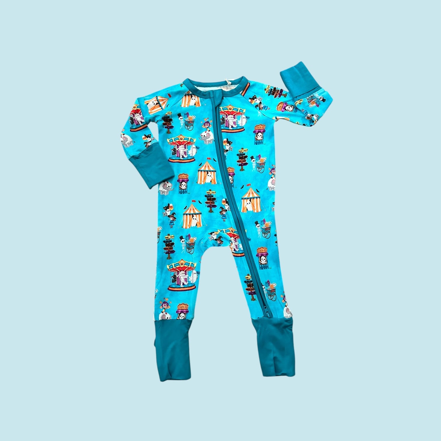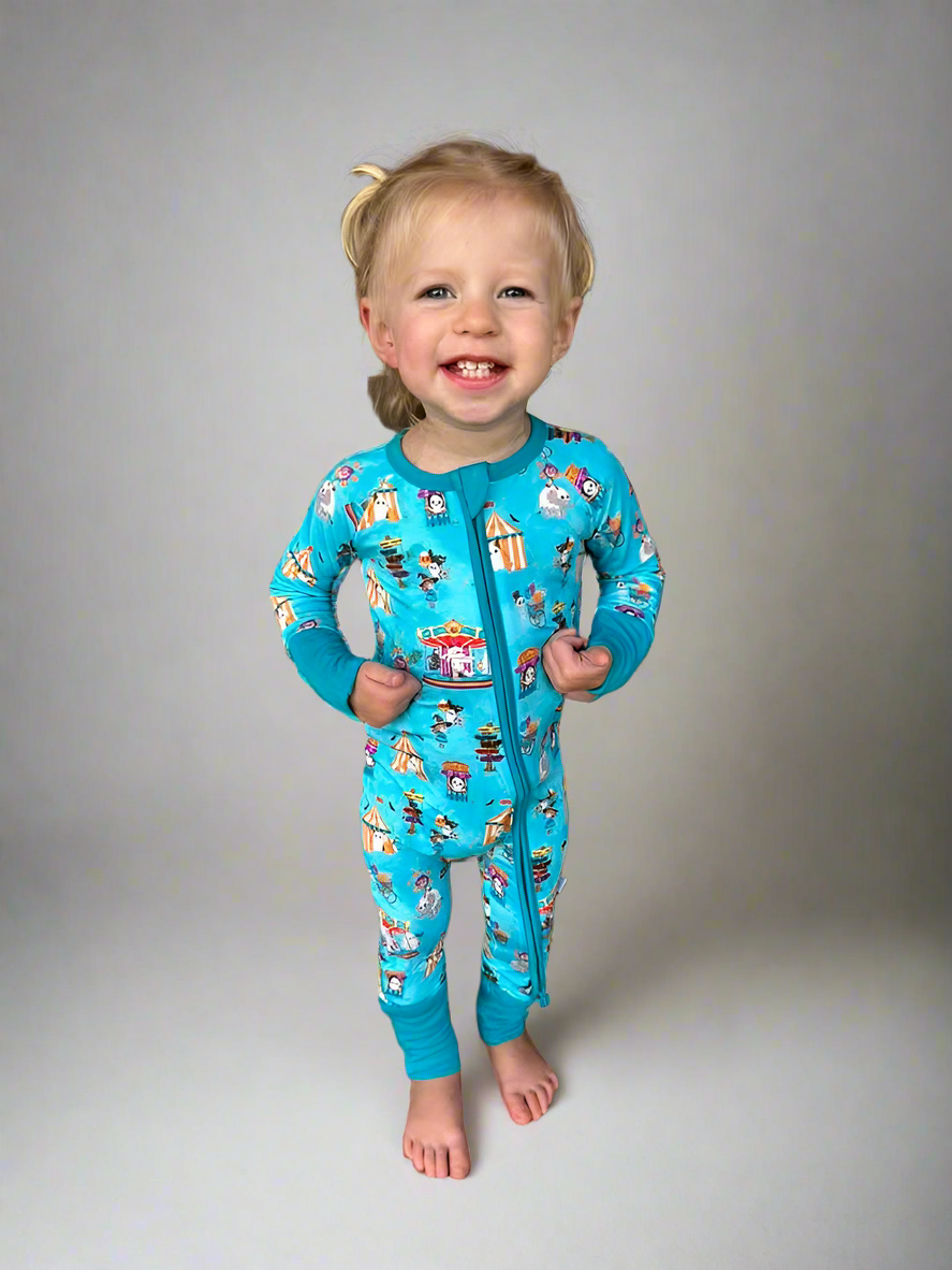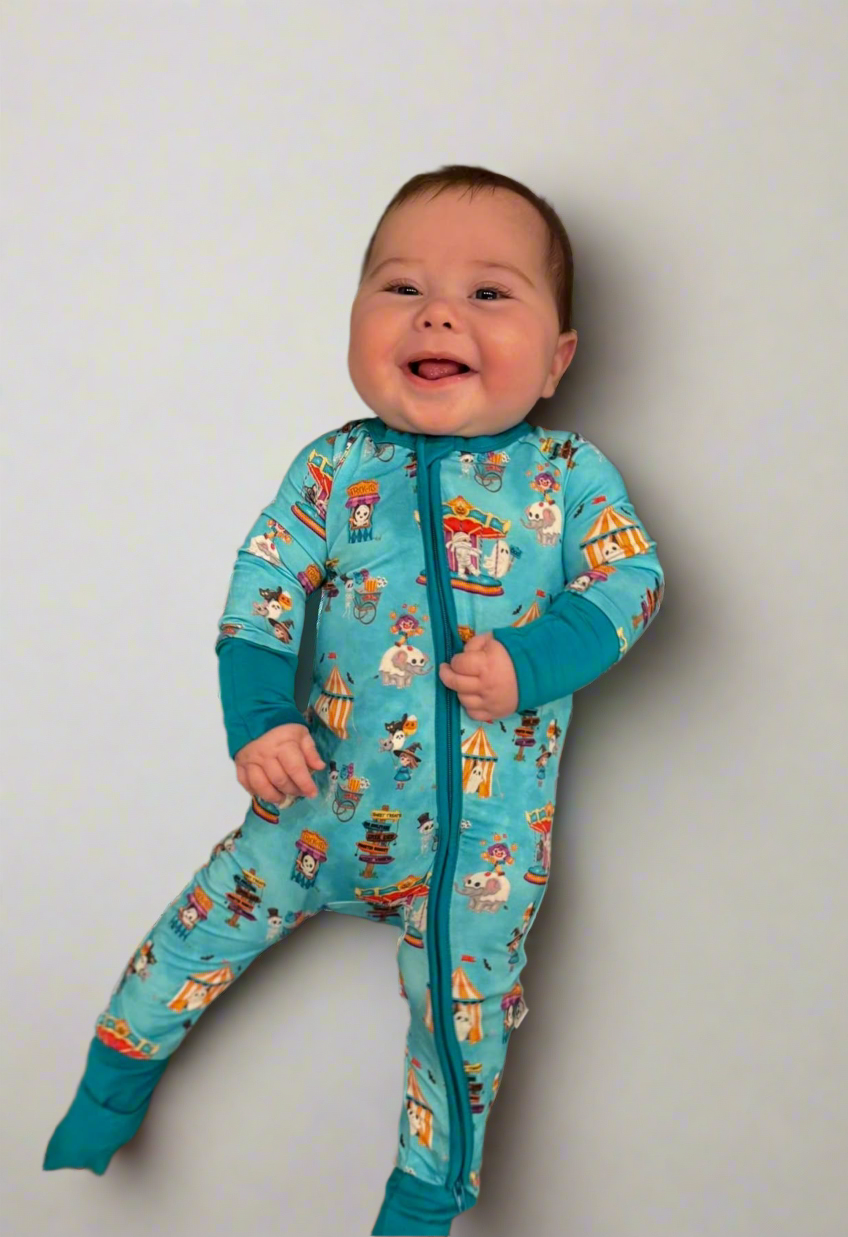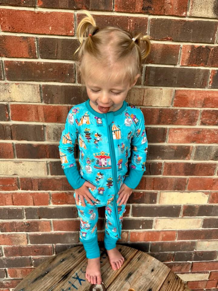 Step right up to the spookiest show on earth! Our Spooktacular Circus Zippy is the ultimate Halloween pajama for babies and toddlers. Featuring a convenient two-way zipper for quick changes, foldover cuffs on smaller sizes, and buttery soft bamboo fabric, this romper keeps your little one cozy, cool, and festive. Perfect for trick-or-treating at home or drifting off to dreamland.