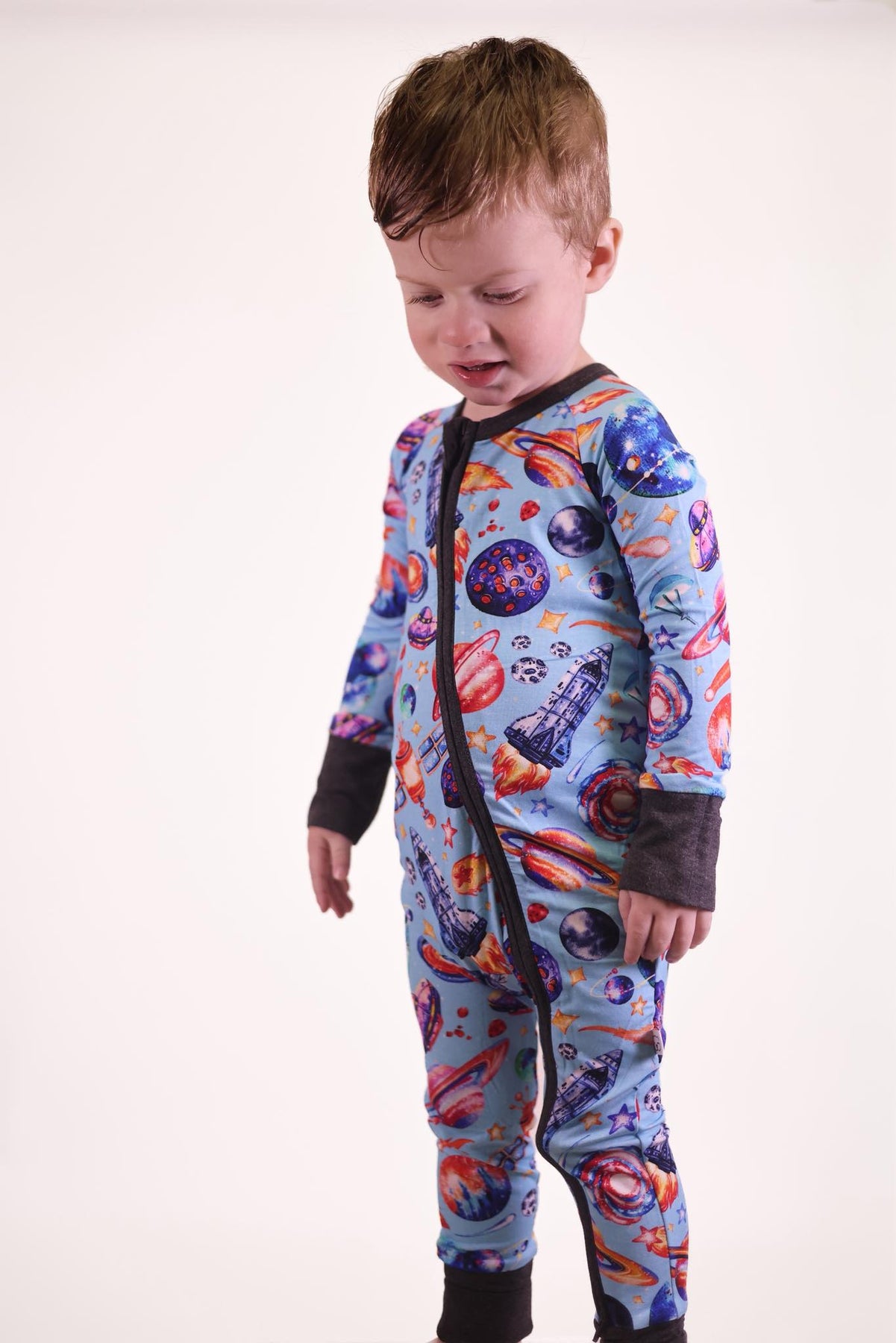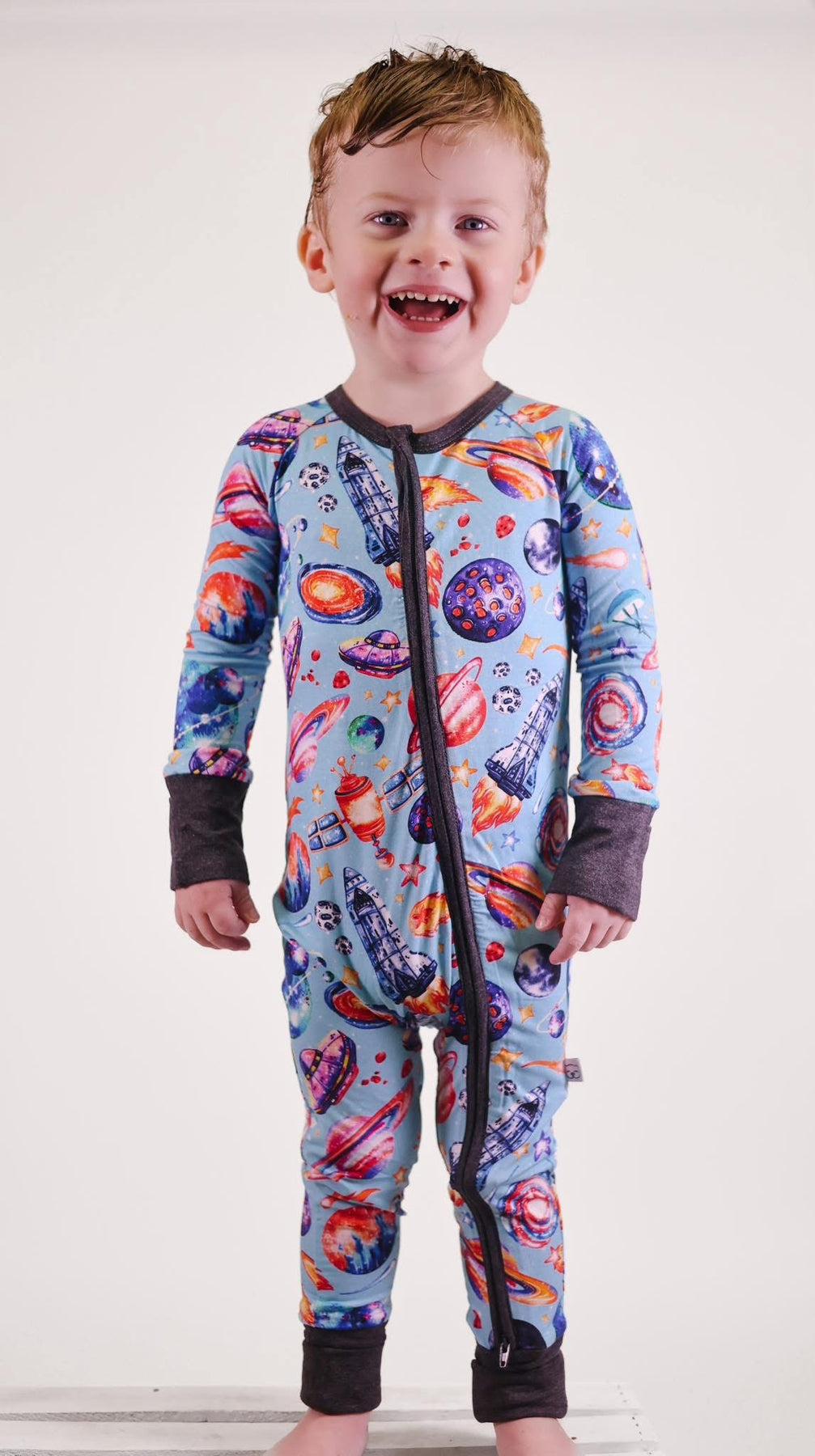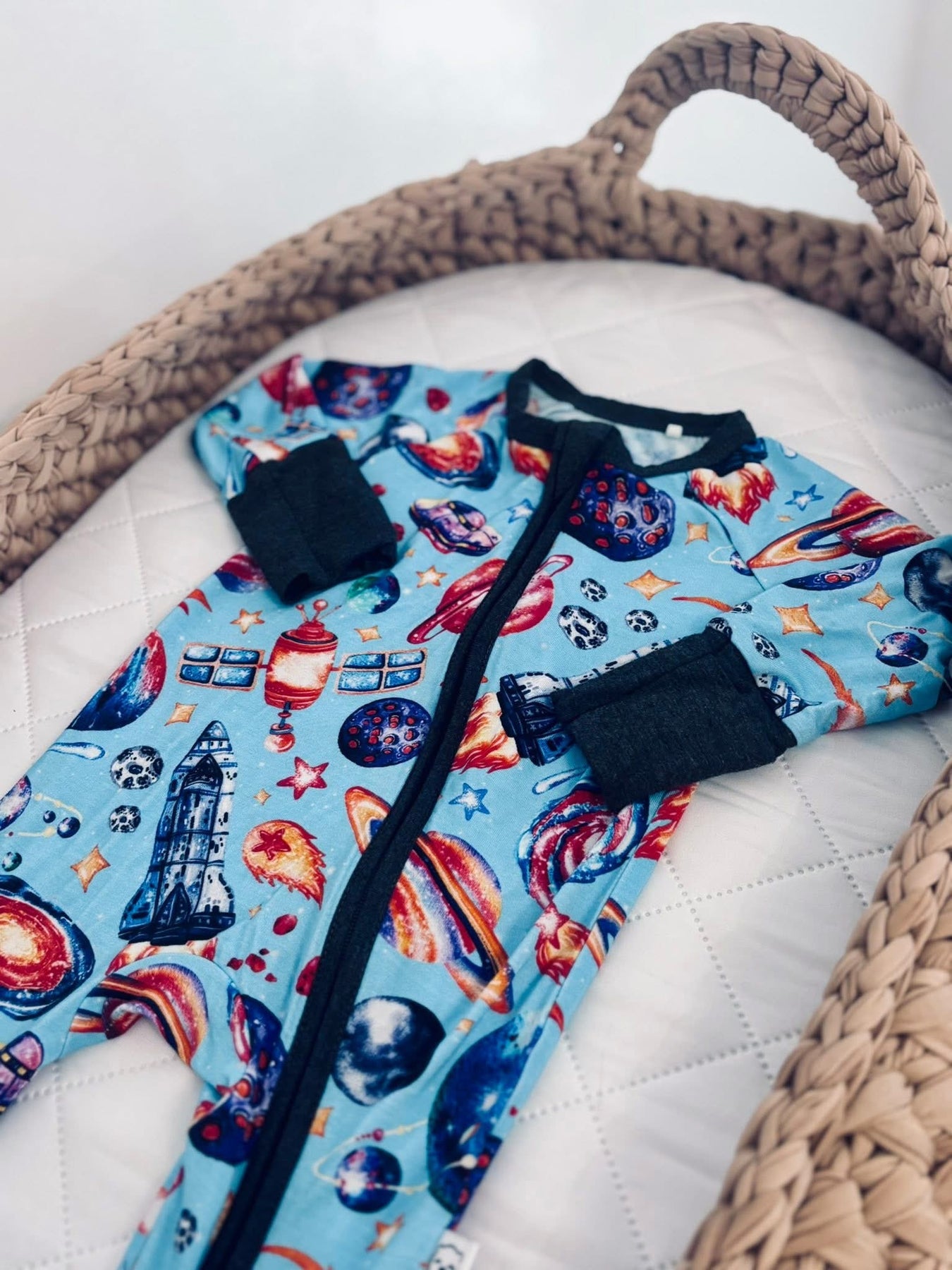 Adventure meets comfort in the Cosmic Cuddles Zippy ๐. This semi-exclusive design by BlueBear features hand-drawn watercolor planets and rockets floating across a serene light-blue background, accented with charcoal heather trim. Made from our signature 95% bamboo viscose / 5% spandex blend, this zippy is designed for cozy nights, easy changes, and all-day comfort.