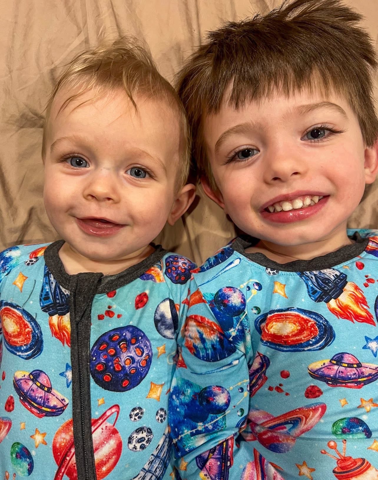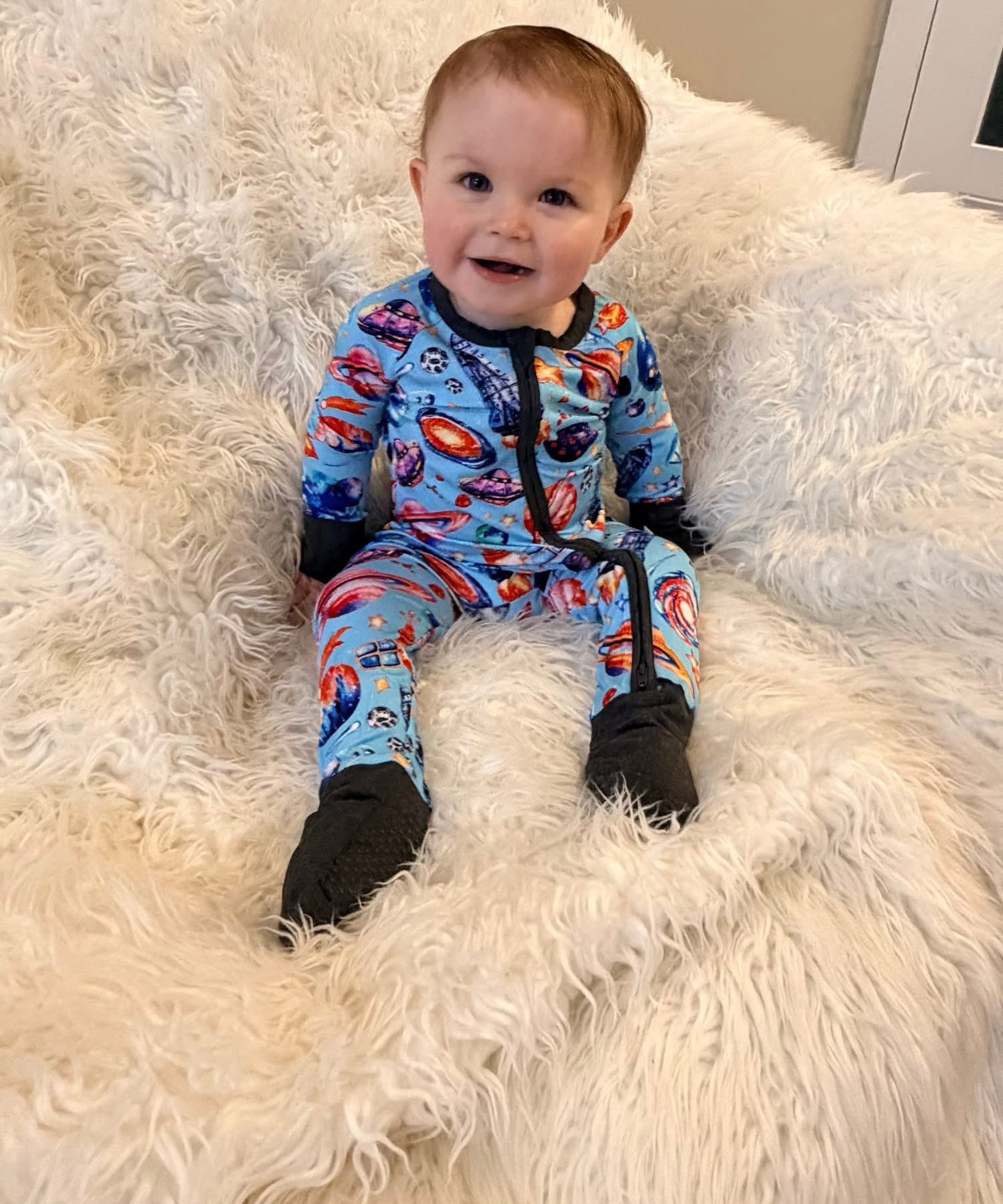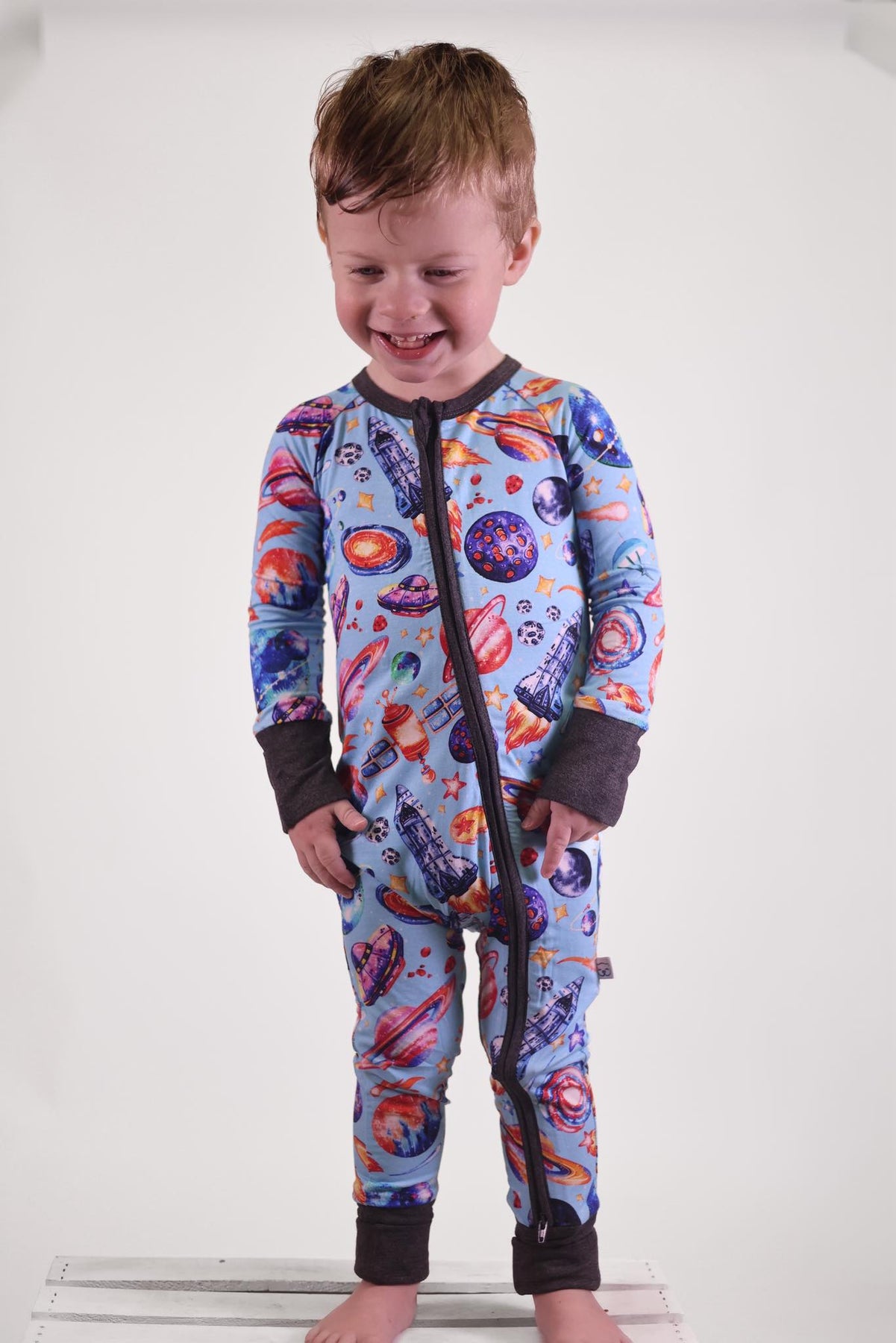 Adventure meets comfort in the Cosmic Cuddles Zippy ๐. This semi-exclusive design by BlueBear features hand-drawn watercolor planets and rockets floating across a serene light-blue background, accented with charcoal heather trim. Made from our signature 95% bamboo viscose / 5% spandex blend, this zippy is designed for cozy nights, easy changes, and all-day comfort.